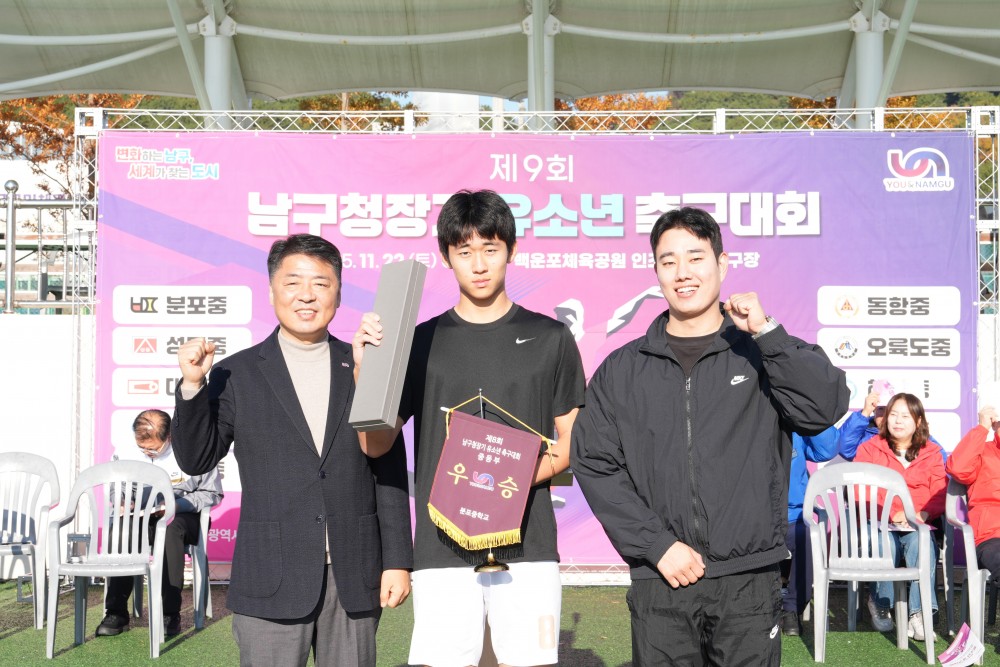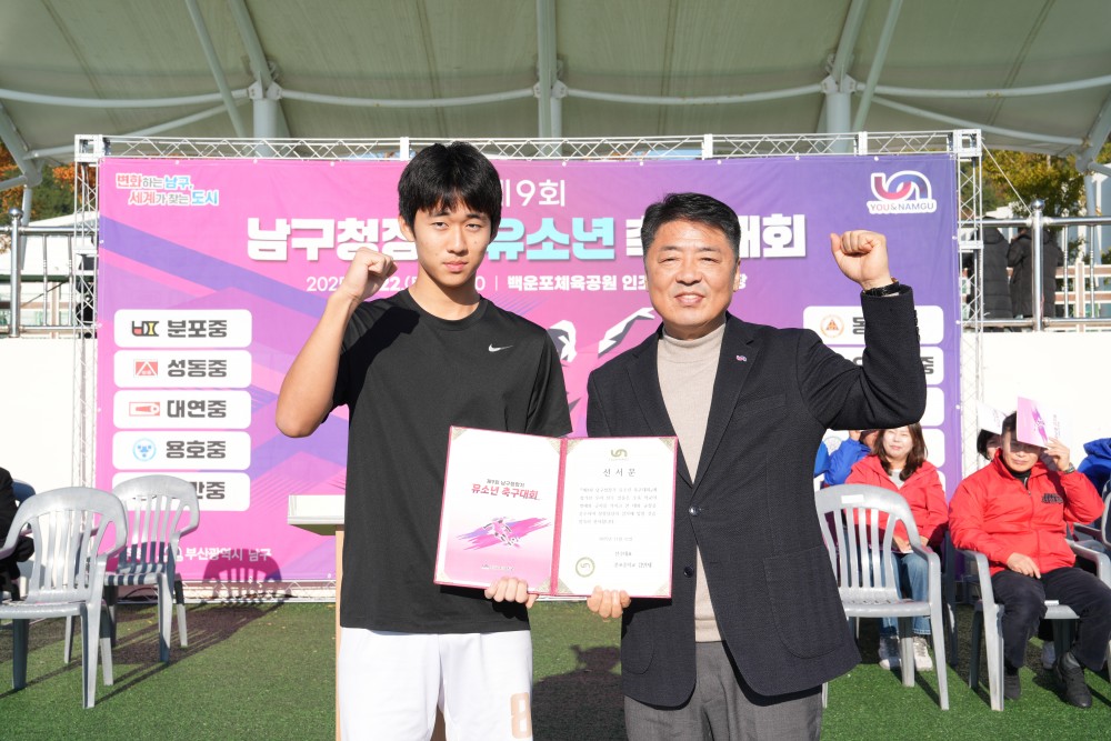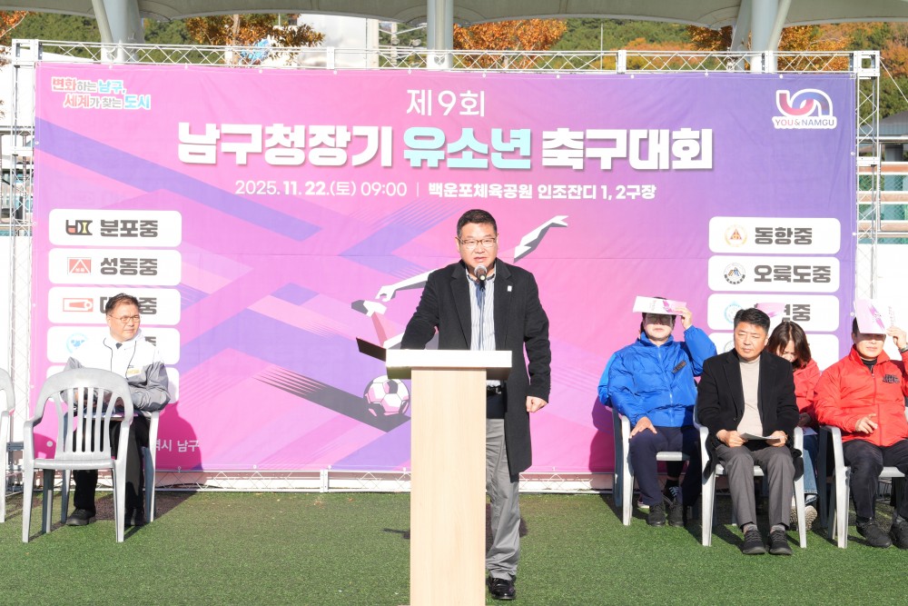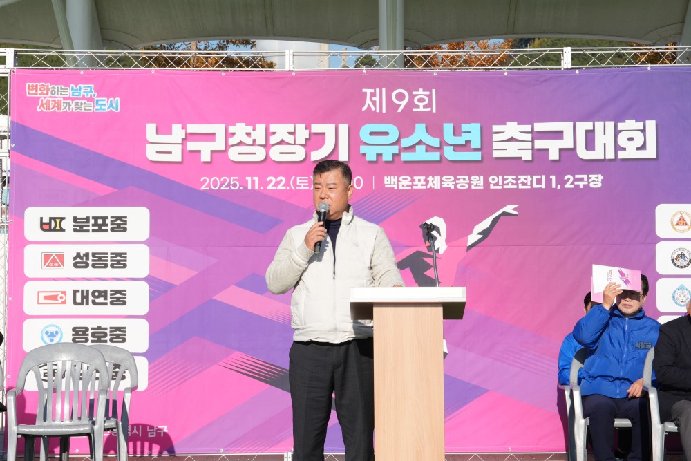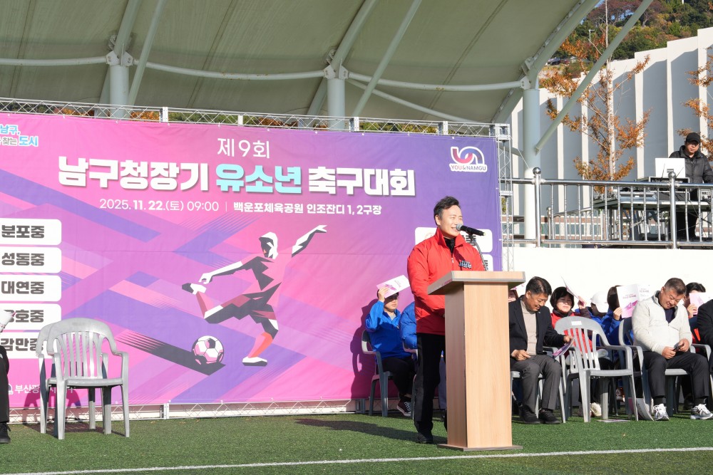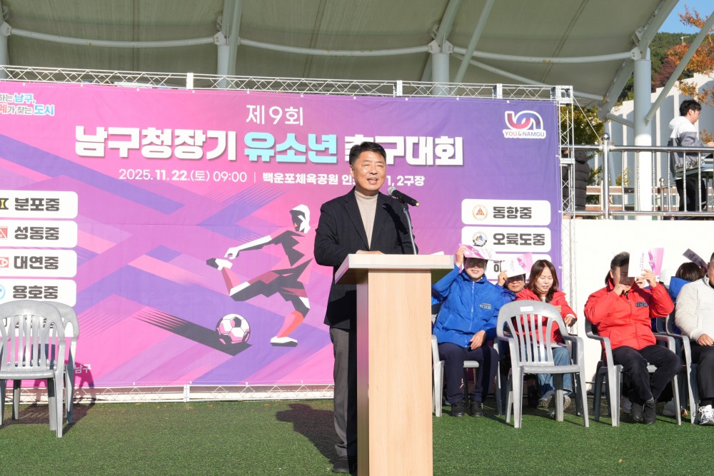 ●내용: 11월 22일(토) 백운포체육공원 인조잔디 1,2구장에서 '제9회 남구청장기 유소년 축구대회'가 열렸습니다. 이날 정춘식 남구체육회장님과 오은택 남구청장님, 서성부 남구의회의장님 등 남구의원님들도 참석하여 자리를 빛내주셨습니다. 유소년 선수들의 뜨거운 열정을 느낄 수 있었고 부상자 없이 성황리에 대회가 마무리됐습니다.