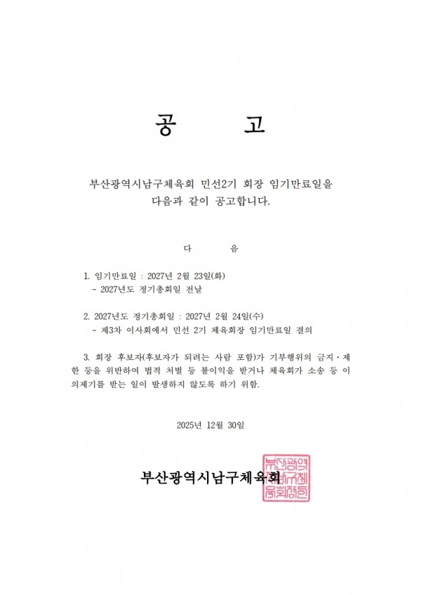 민선2기 남구체육회장 임기만료일 공지 알림