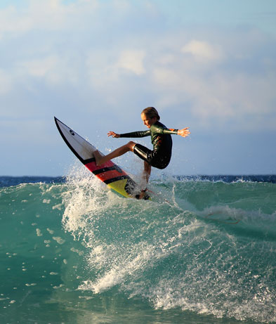 서핑을 통해 전신의 근력과 균형 감각을 발달시키고, 변화무쌍한 바다 환경에 적응하며 인내심과 판단력을 기를 수 있습니다.